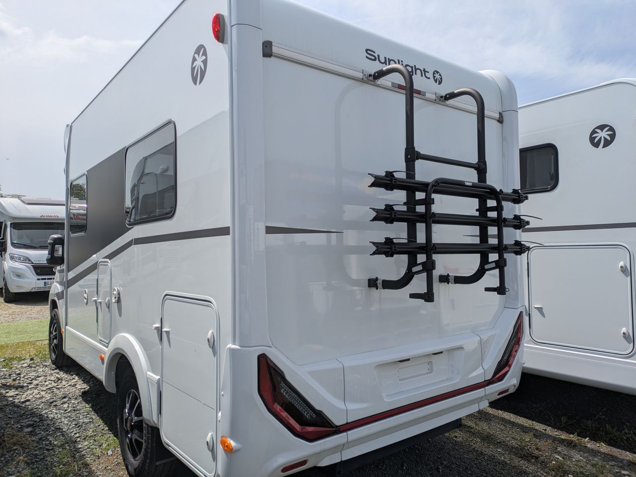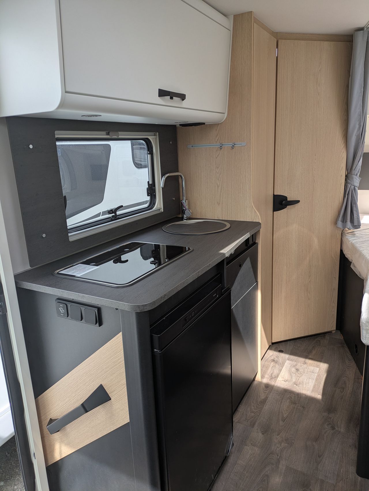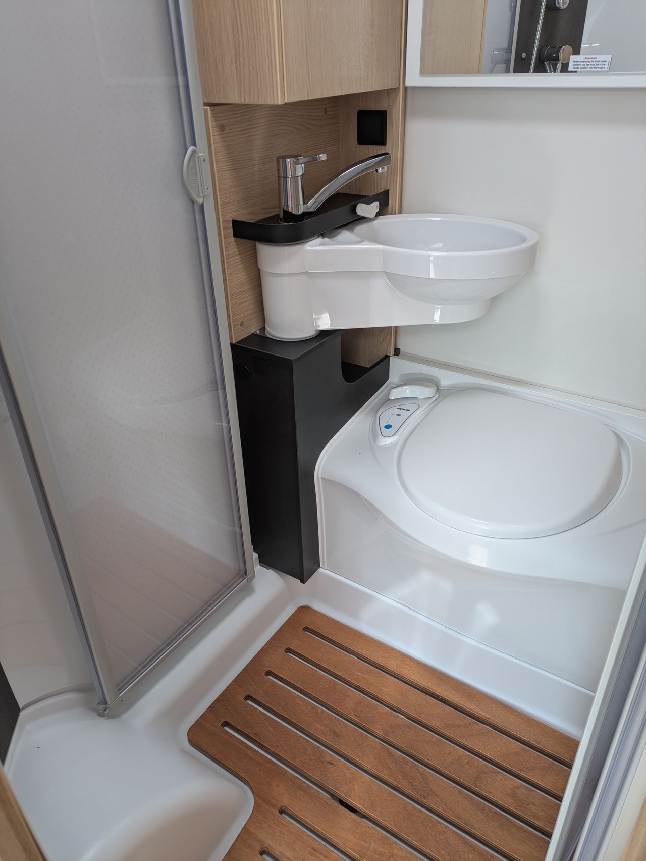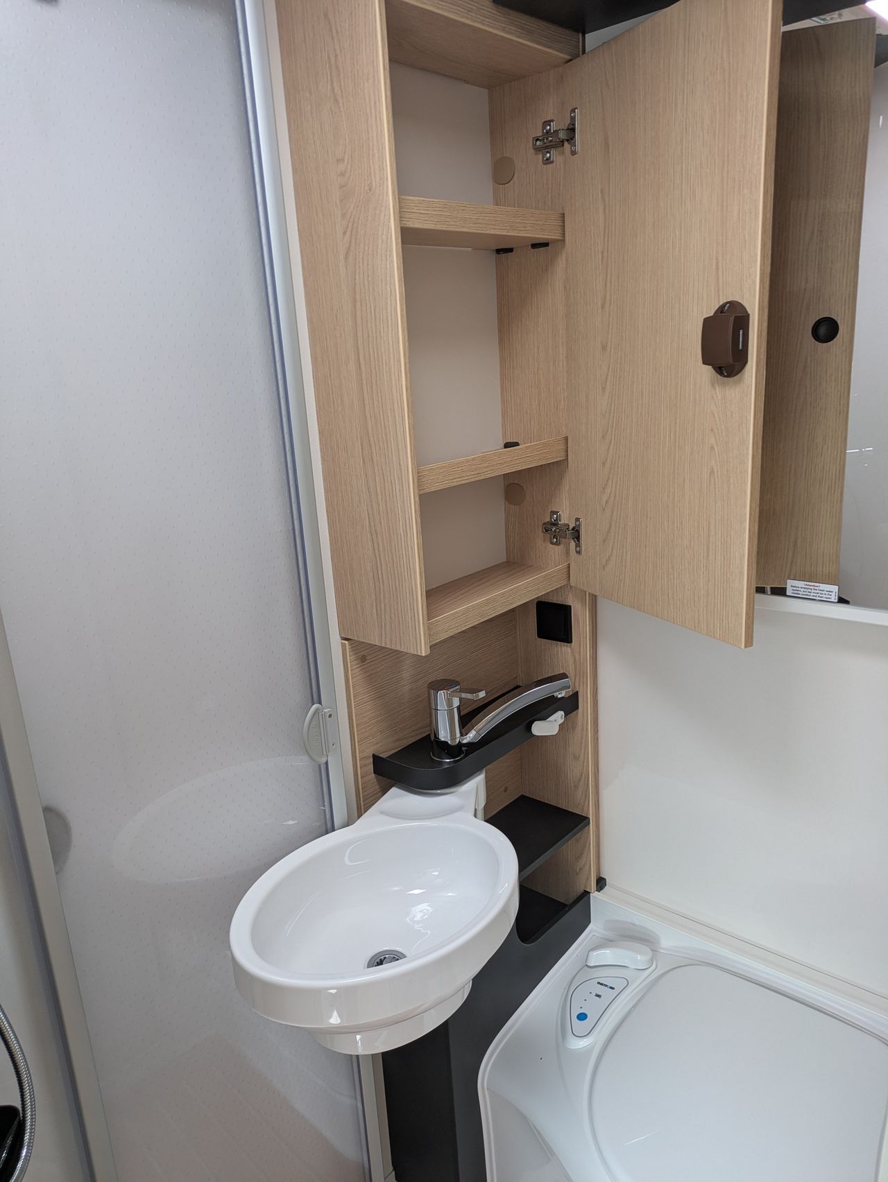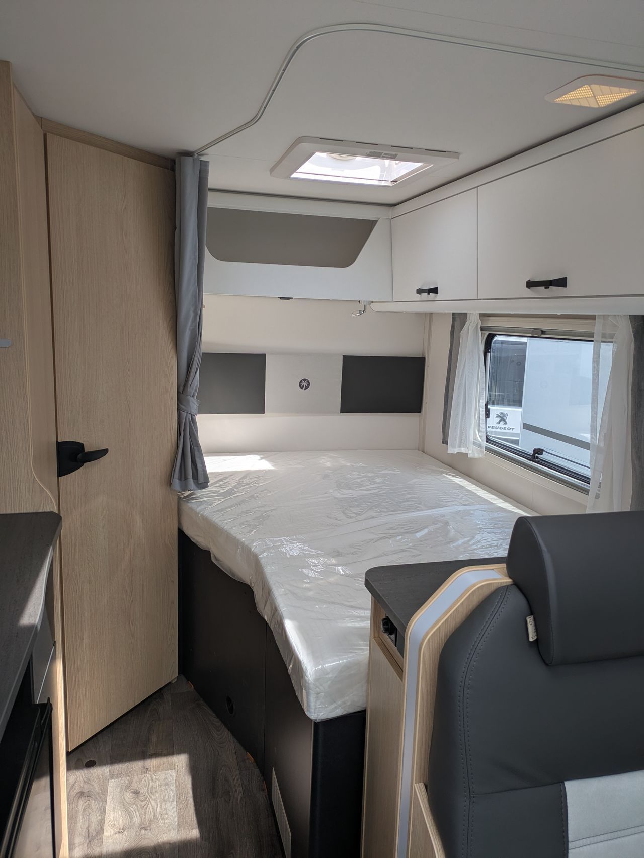 Petit profilé avec lit à la française, en 5.95m. Beau cabinet de toilette lumineux et fonctionnel, une vrai porte de douche, un lavabo pivotant, de nombreux rangements.