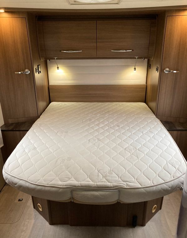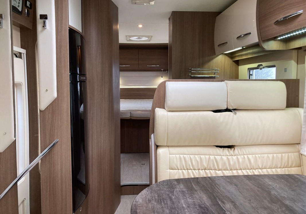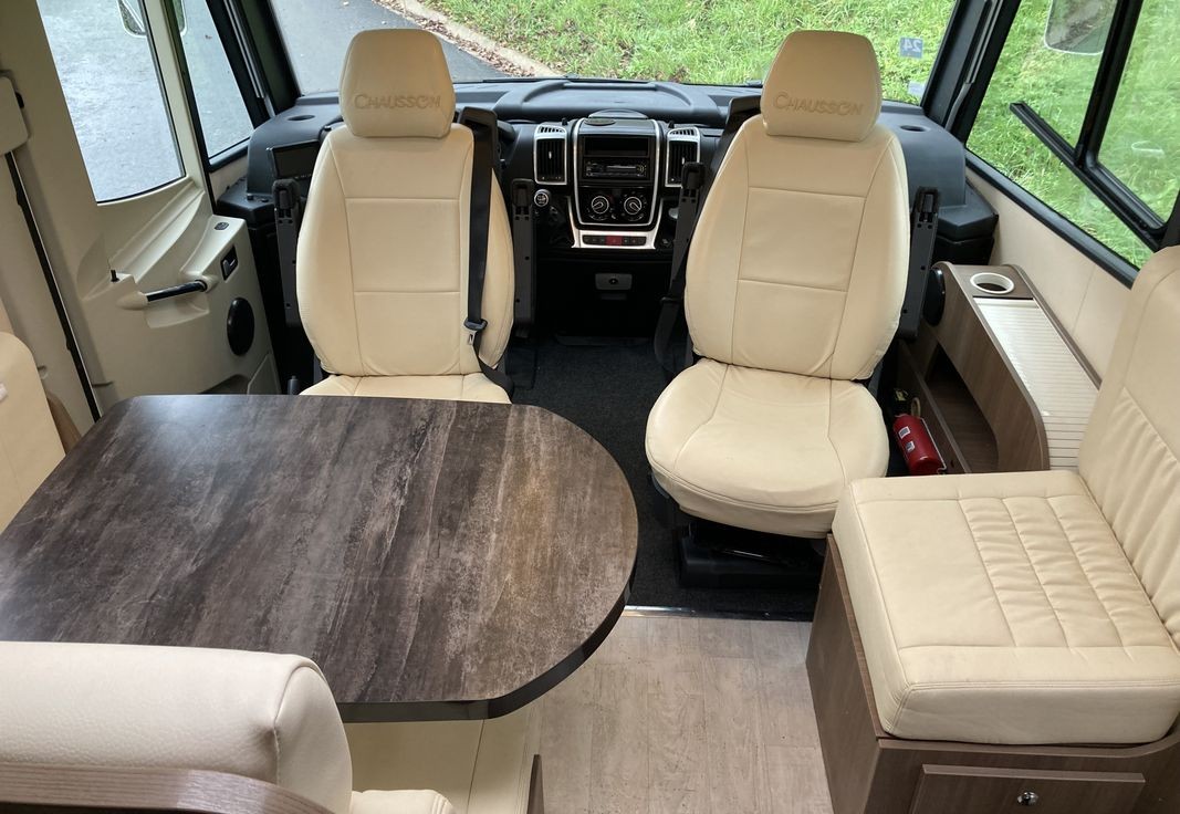 Roche Evasion vous propose cet intégral Chausson avec lit central et lit pavillon, Cabinet de toilette WC + douche séparés et Espace cuisine équipé : réfrigérateur, plaques gaz, évier