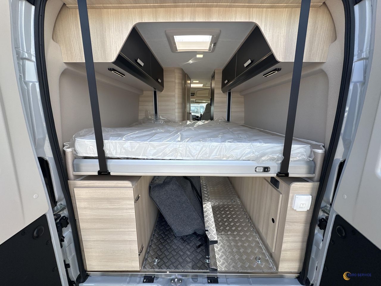 Jusqu'alors, dans un van, il fallait choisir entre garage et couchage. Le V210 est doté d'un véritable garage (pour 2 vélos) et d’un véritable couchage aux dimensions XXL. Son secret ? Un lit de pavillon électrique (au-dessus du garage) qui peut être accessible sans échelle si le garage n’est pas utilisé.