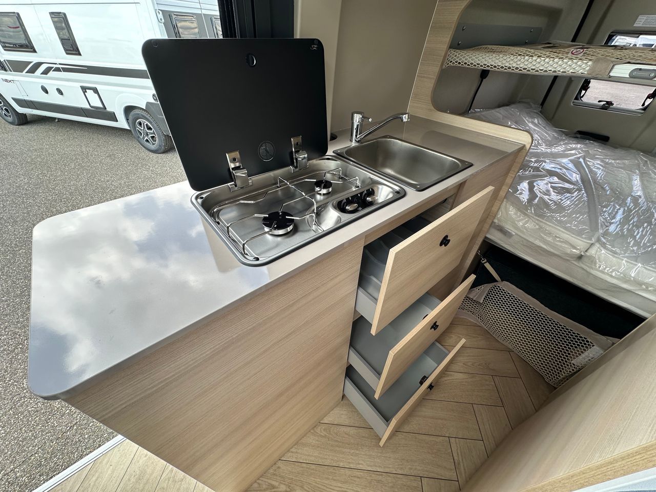 En moins de 6 m, le très astucieux V114MAX, propose 4 couchages permanents totalement modulables selons vos envies. En effet, les couchettes arrières sont amovibles : Vous partez à 2 ou 3 seulement, retirez certains couchages pour profiter d'espaces de rangement décuplés.