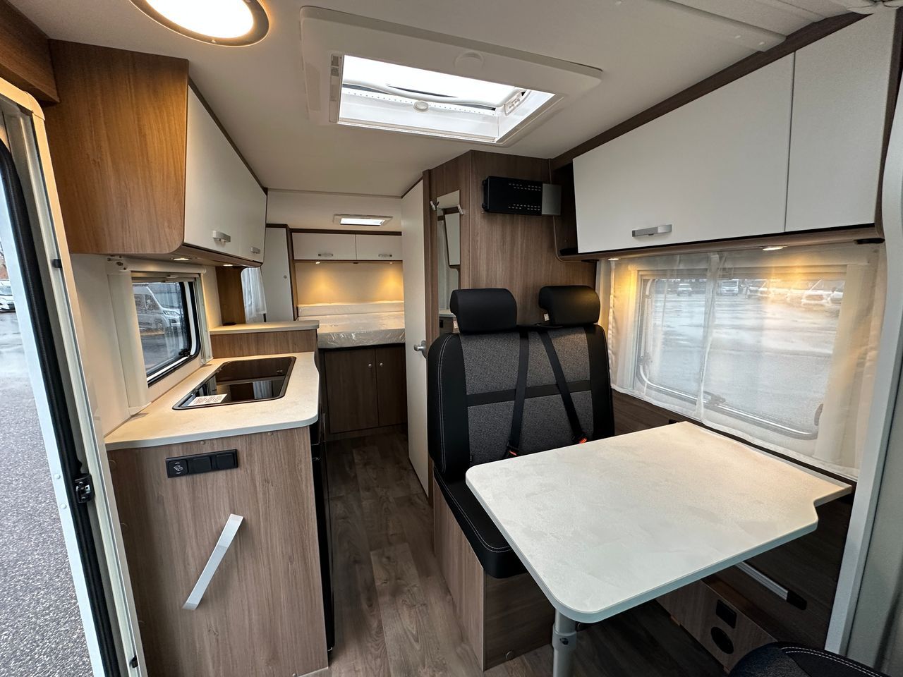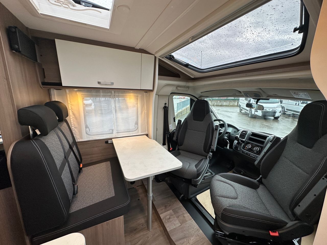 Moteur 140 ch, Couleur extérieure gris Artense métallisé, Pack Optique, Toit panoramique de cabine, 2ème trappe de soute, Réservoir eaux usées isolé, Store extérieur 4,0 m coloris blanc, Stores plissés de cabine, Coloris spécifique des portes des meubles de pavillon, Jantes alliage, Pack Confort.