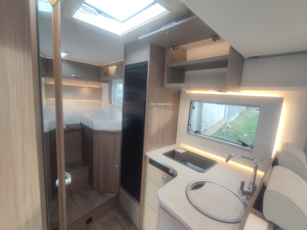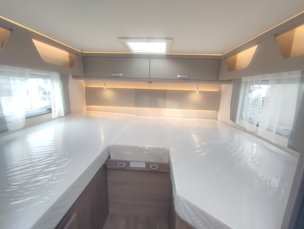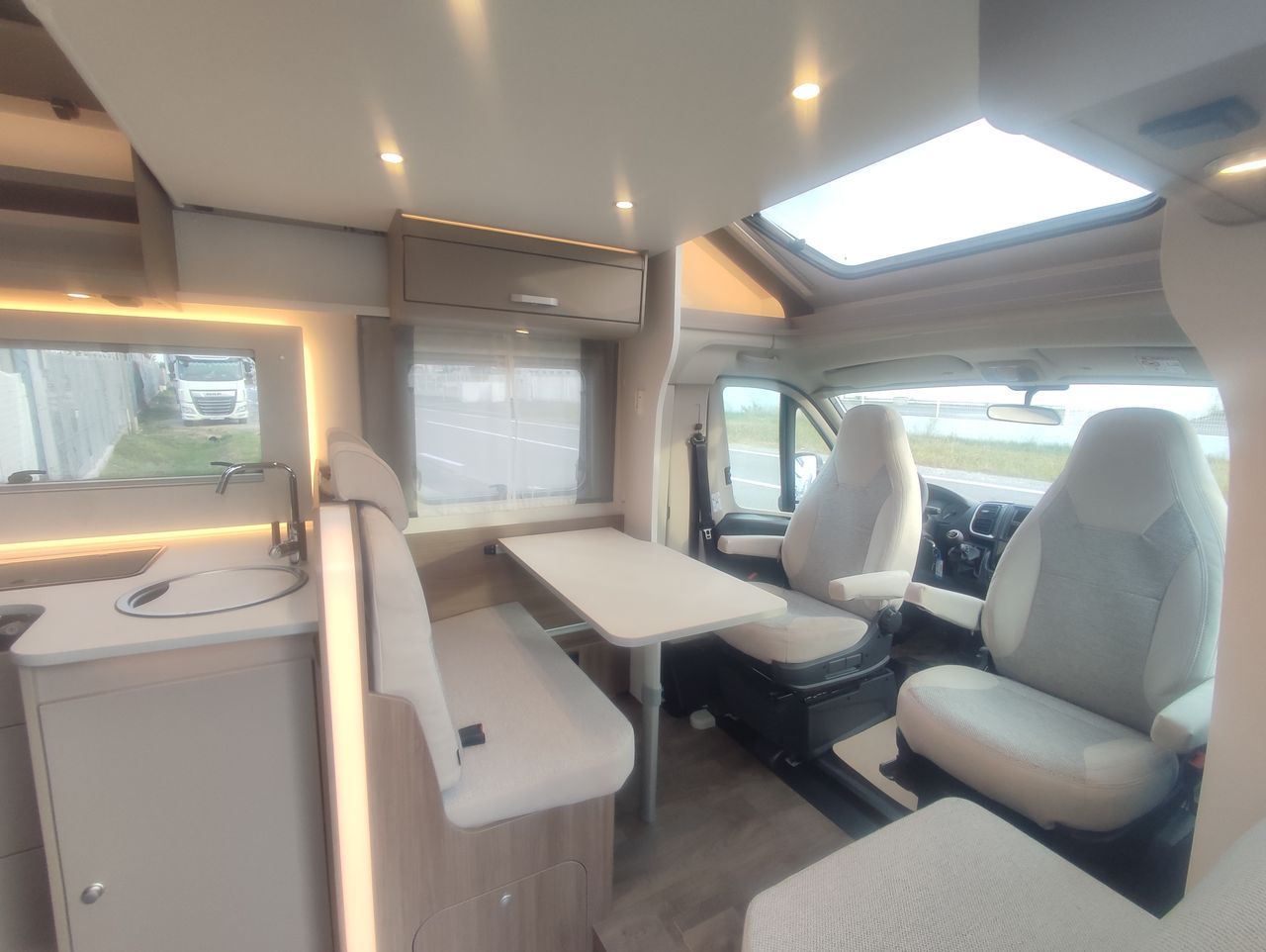 Option incluses : Lit dinette, 5ème place carte grise, Montants design arrière, Store plissé cabine, Pack optique 1et 2, Pack confort, Ambiance sellerie ICE, Climatisation cabine, Large marche pied électrique, Equipement de douche Lanterneau panoramique + Porte moustiquaire*, soute double accès, couleur exterieur blanc glacier.