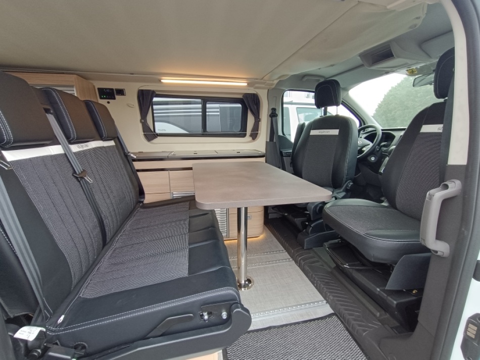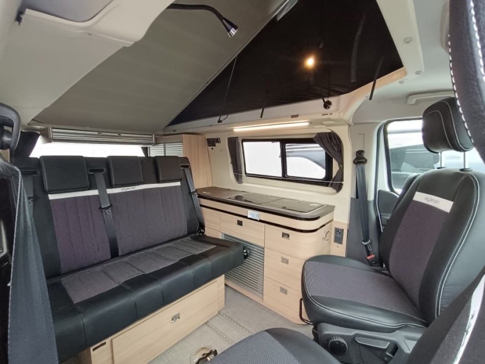 Son toit relevable qui ouvre sur un vrai coin nuit, aéré et lumineux. La banquette convertible en lit douillet pour deux. La cuisine équipée (frigo, réchaud, évier) : de quoi cuisiner simplement, partout. Le chauffage stationnaire pour rester bien au chaud même en hiver. Les sièges pivotants, pour créer un vrai petit salon dès l’étape
