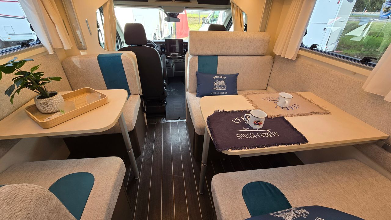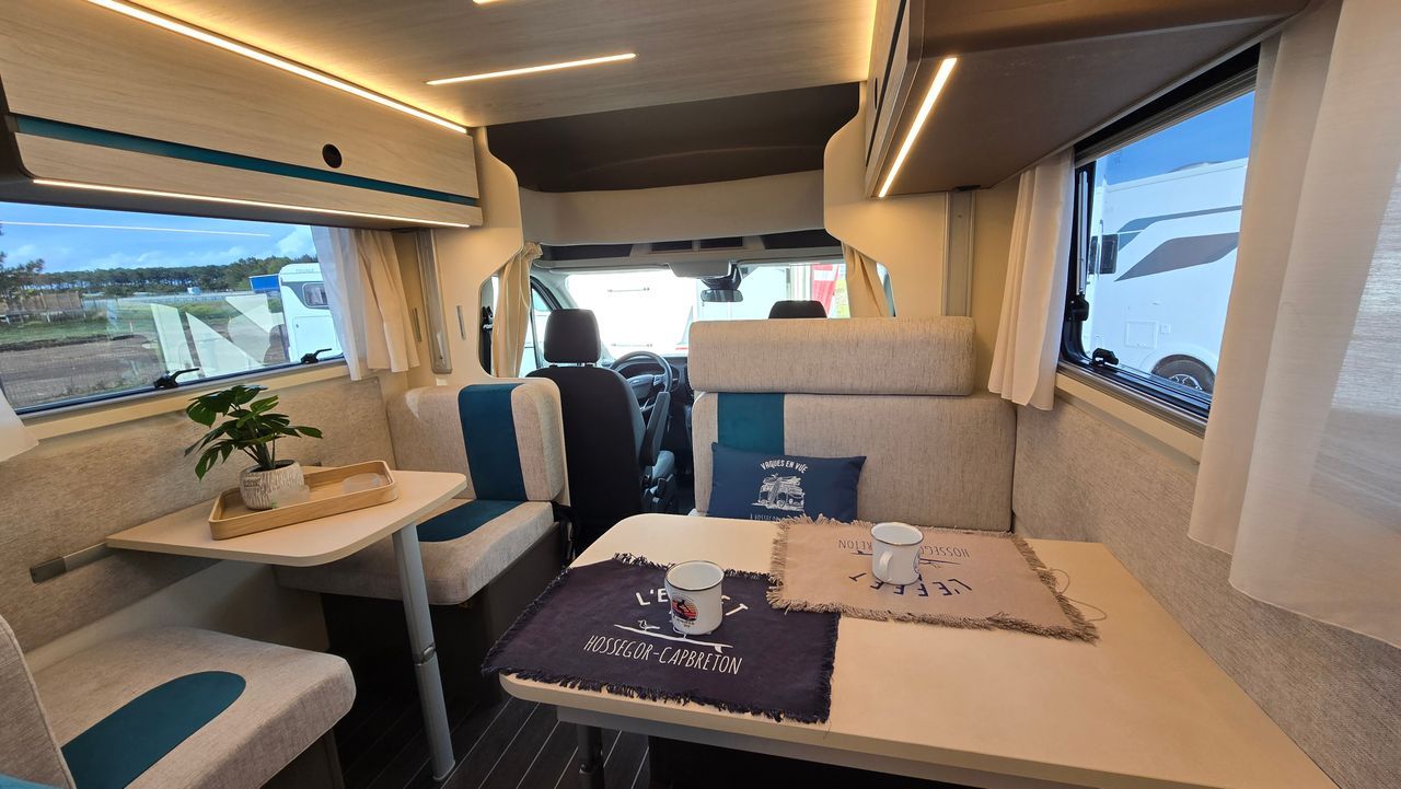 Ce profilé de moins de 7 mètres offre 7 places carte grise et une capacité de 7 couchages familiale grâce au lits superposés, lit pavillon, deux dînette.