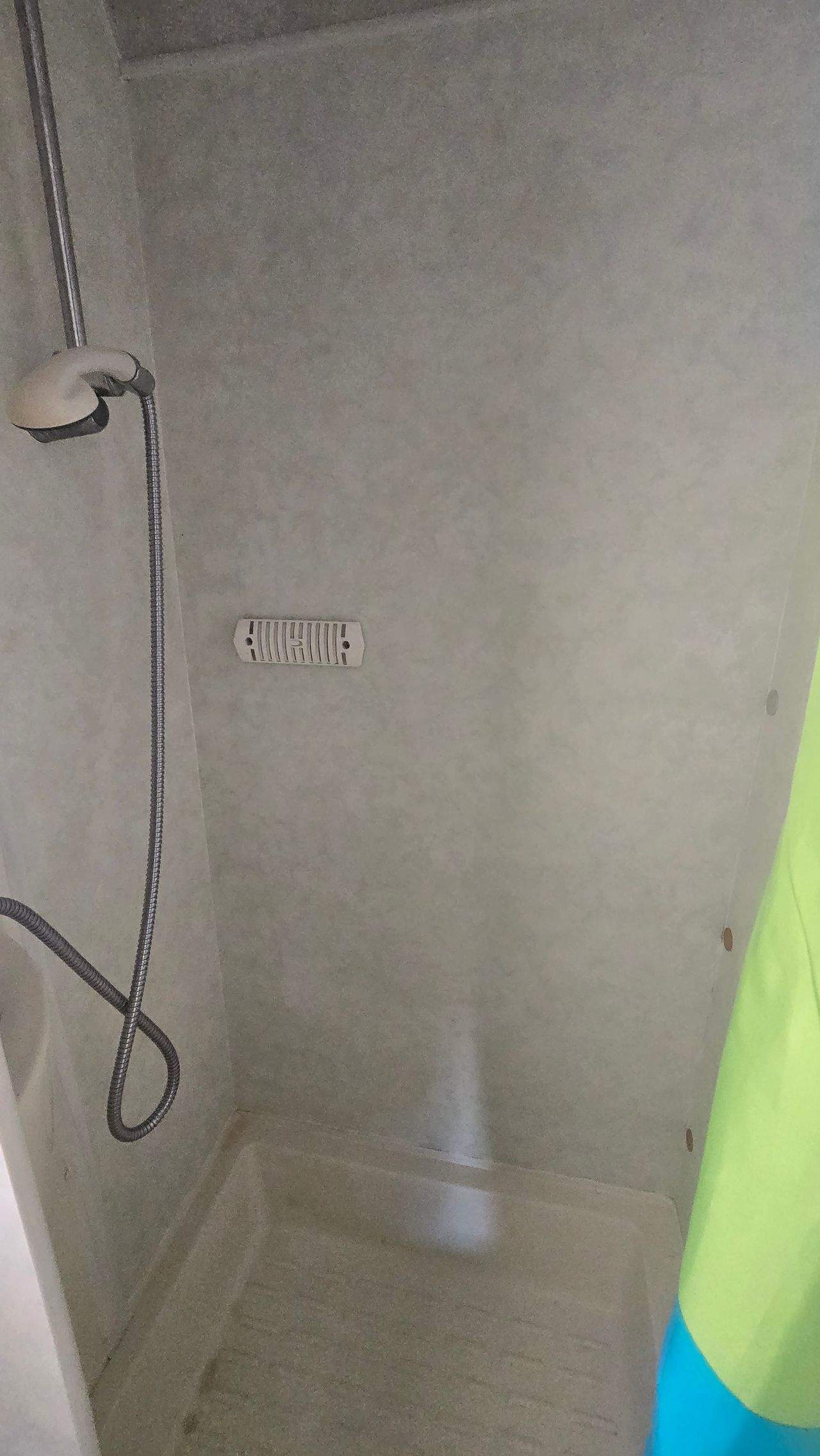 Un profilé qui offre un espace salon spacieux et un coin cuisine avec un évier et une plaque de cuisson. La salle de bain est composée d'un lavabo,wc et la douche séparée.