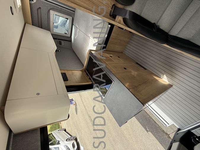 Ce magnifique fourgon de 5.40m avec sa maniabilité maximale, est équipé d’une dinette harmonieuse et lumineuse pour 4 personnes. Sa cuisine latérale fonctionnelle est dotée d’un réchaud 2 feux, d’un évier inox, de couvercles en verre, d’un réfrigérateur à double ouverture et d’un plan de travail haute résistance. En face, sa salle d’eau avec WC à cassette, lavabo escamotable, miroir et un caillebotis vous apportera une sensation de bien-être. A l’arrière, vous y retrouverez un lit transversal pour des nuits agréables et confortables. Sans oublier ses nombreux rangements astucieux.