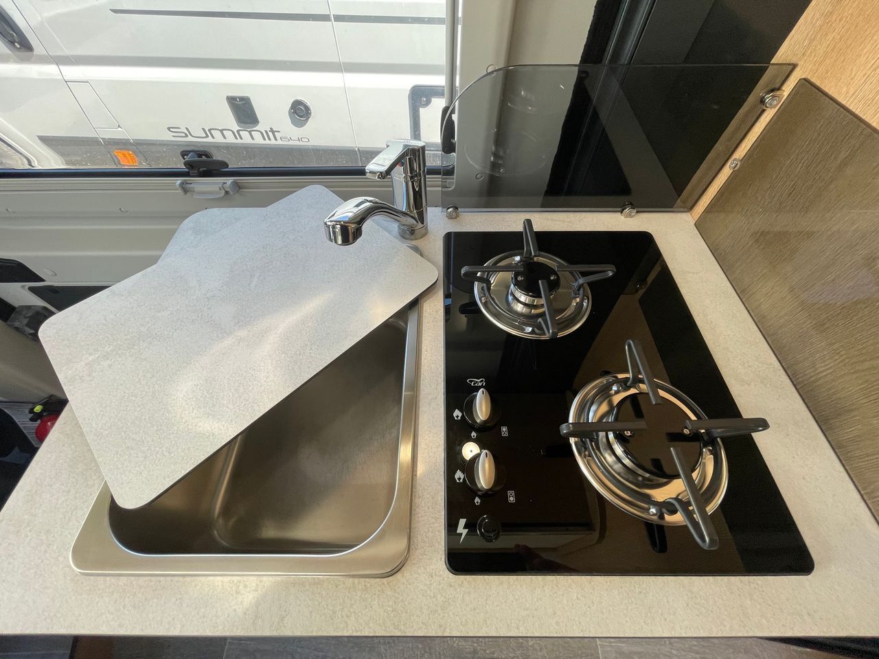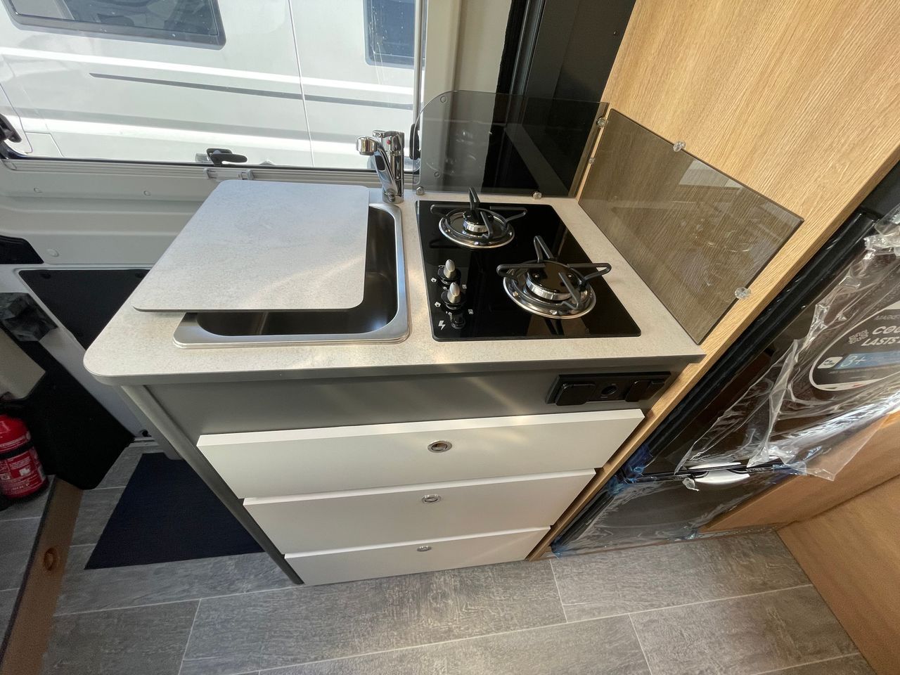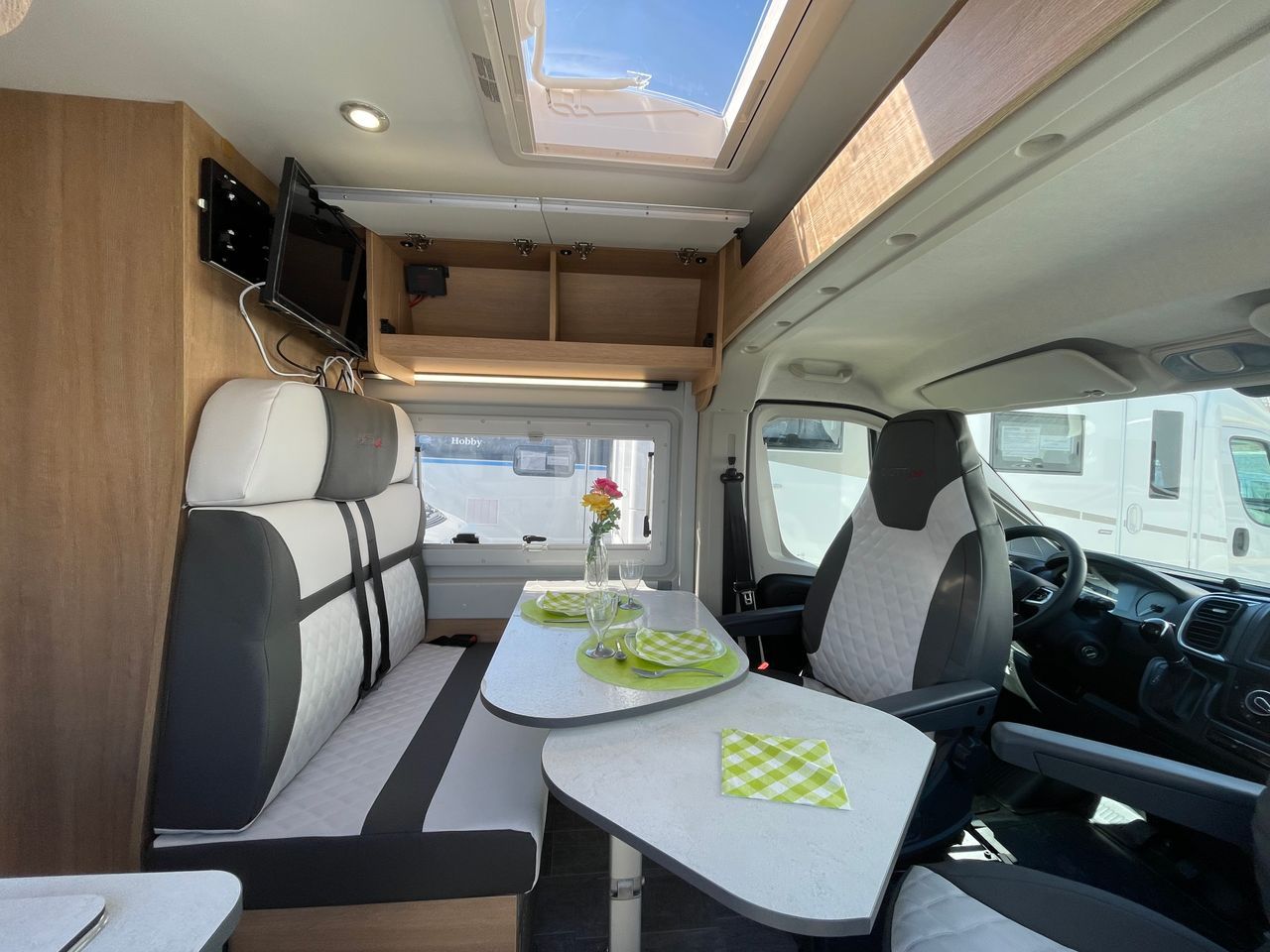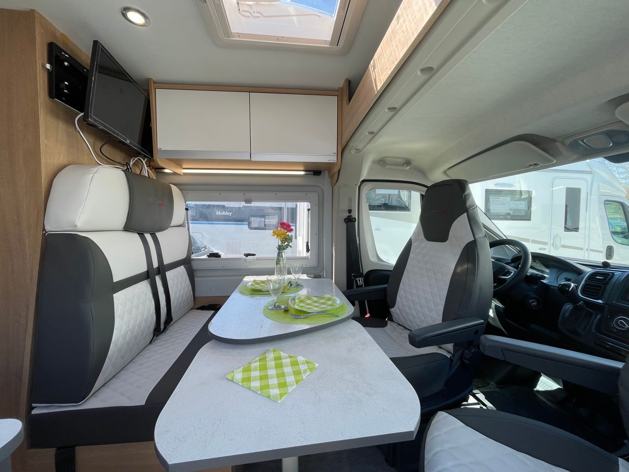 À l'avant, la dinette spacieuse permet également de se transformer en lit d'appoint, et on y retrouve également un grand réfrigérateur à compression de 135L, la climatisation cabine, ou encore un chauffage et chauffe-eau Truma. La salle de bain est équipée d'un bac de douche, d'un WC compact ainsi qu'un astucieux lavabo pivotant.