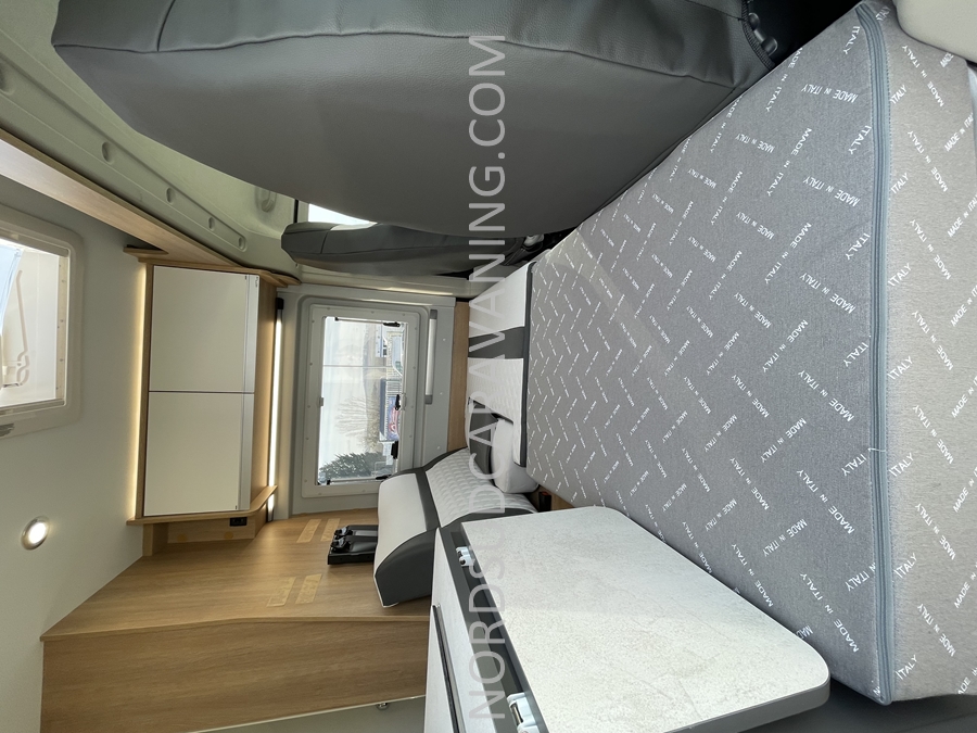 Ce nouveau modèle familial se distingue par ses lits doubles superposés modulables à l'arrière, qui permettent selon les besoins de chacun de bénéficier de trois configurations : deux lits doubles superposés, un lit double en bas et une couchette en haut, ou alors un seul lit double en position basse. Ces possibilités sont rendues possibles grâce à son sommier coulissant, qui permet d'imaginer de nombreuses possibilités.