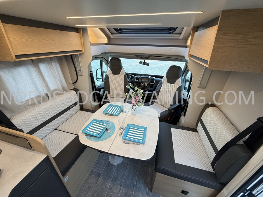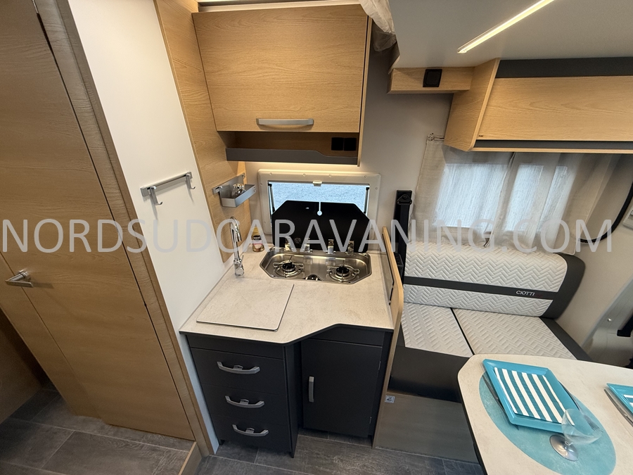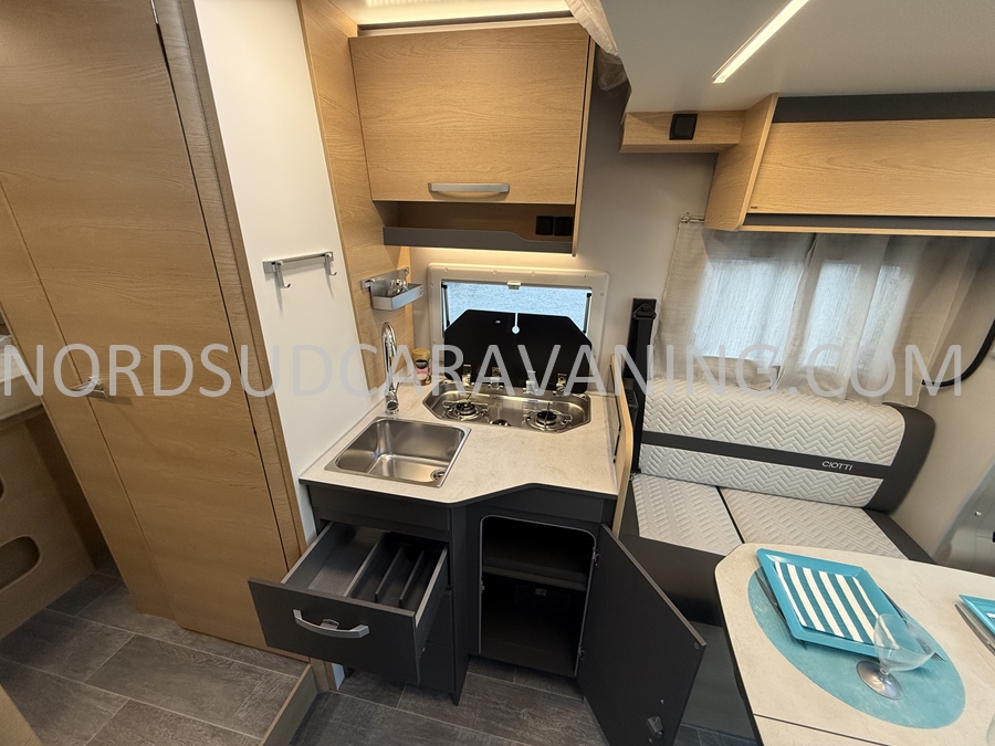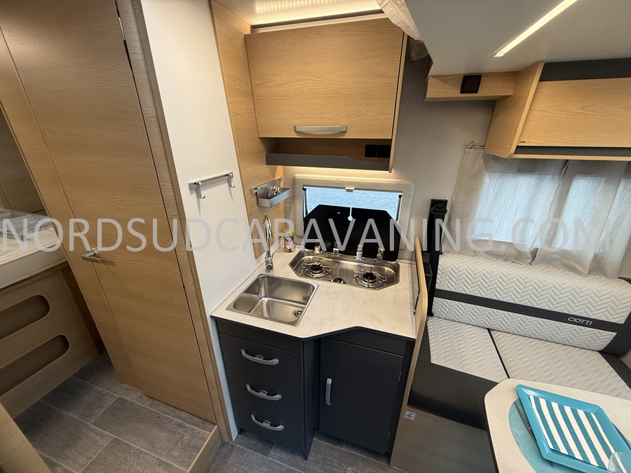 Il est doté également d’une cuisine équipée de plaque cuisson 2 feux, d’un évier inox et d’un grand réfrigérateur (160L), sans oublier son joli salon face à face avec table pliante et ses nombreux rangements astucieux. Sa spacieuse soute avec une capacité de rangements de 300kg est accessible de l'extérieur grâce à deux portillons.