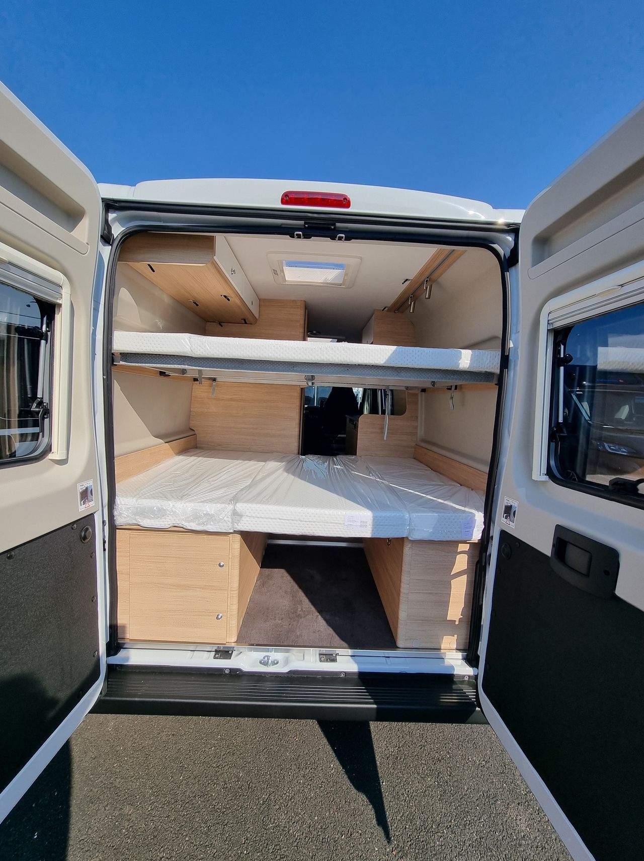 - Pack Confort :- Marchepied électrique- Moustiquaire porte latérale- Lanterneau Midi-Heki au dessus de la dînette- Rideau occultant cabine- Equipement de douche (rideau + pommeau)