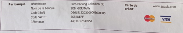 Les personnes ayant reçu ces amendes doivent les payer à une entreprise privée allemande du nom d’EPCPLC (Euro Parking Collection PLC) qui gère les règlements. C’est d’ailleurs sur un compte allemand que les virements doivent être réalisés. C’est ainsi : la commune de Londres délègue ses fonctions de recherche, d’émission et de collecte d’avis/amendes/frais liés à la circulation pour les véhicules immatriculés en dehors de la juridiction du Royaume-Uni.