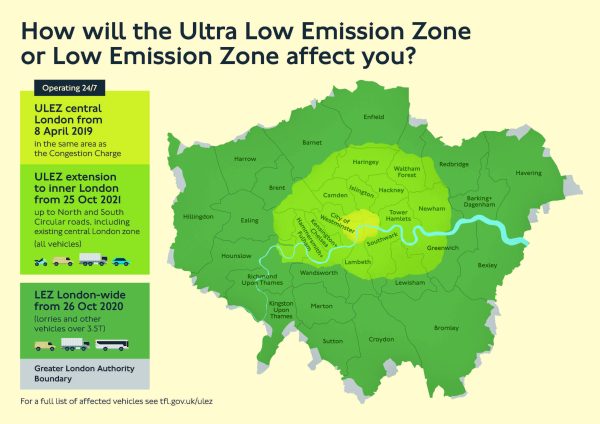 Attention ! La Ultra Low Emission Zone (ULEZ) a été élargie depuis le 25 octobre 2021. Cependant, elle concerne uniquement les usagers ayant des véhicules de moins de 3,5 tonnes et ne respectant pas la norme EURO VI. Le ministère des transports a annoncé que cette zone sera de nouveau élargie dès le 29 août 2023. Elle devrait alors couvrir l’ensemble des arrondissements de Londres. Les propriétaires des véhicules impactés devront alors payer 12,5 £ par jour sous peine de recevoir une amende de 160 £.
