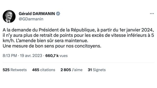 L'information circulait depuis un moment déjà et a été officialisé mi-avril dernier par le Ministre de l'Intérieur, Gérald Darmanin. La fin du retrait de point en cas d'excès de vitesse inférieur à 5 km/h fera l'objet d'une mesure qui entrera en vigueur au 1er janvier 2024.