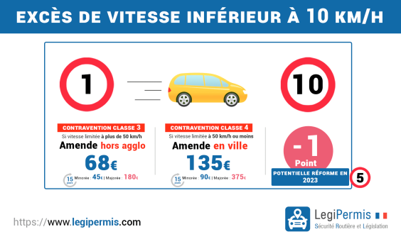 Jusqu'à présent, (et jusqu'à 2024 donc) un excès de vitesse inférieur à 10 km/h entraîne la perte d'un point sur le permis de conduire et une amende forfaitaire de 135€ en ville et 68€ hors agglomération. Attention, comme le précise monsieur le Ministre, l'amende continuera de s'appliquer sur les usagers de la route. Hors agglomération, sur les routes dont la limitation est supérieure à 50 km/h, un excès de vitesse de moins de 20 km/h entraîne une amende forfaitaire de 68 € (minorée à 45 €). Là où son montant s'élève à 135 € (minorée à 90 €) lorsque l'excès de vitesse est inférieur à 5 km/h sur les routes dont la limitation est inférieur à 50 km/h (agglomération).