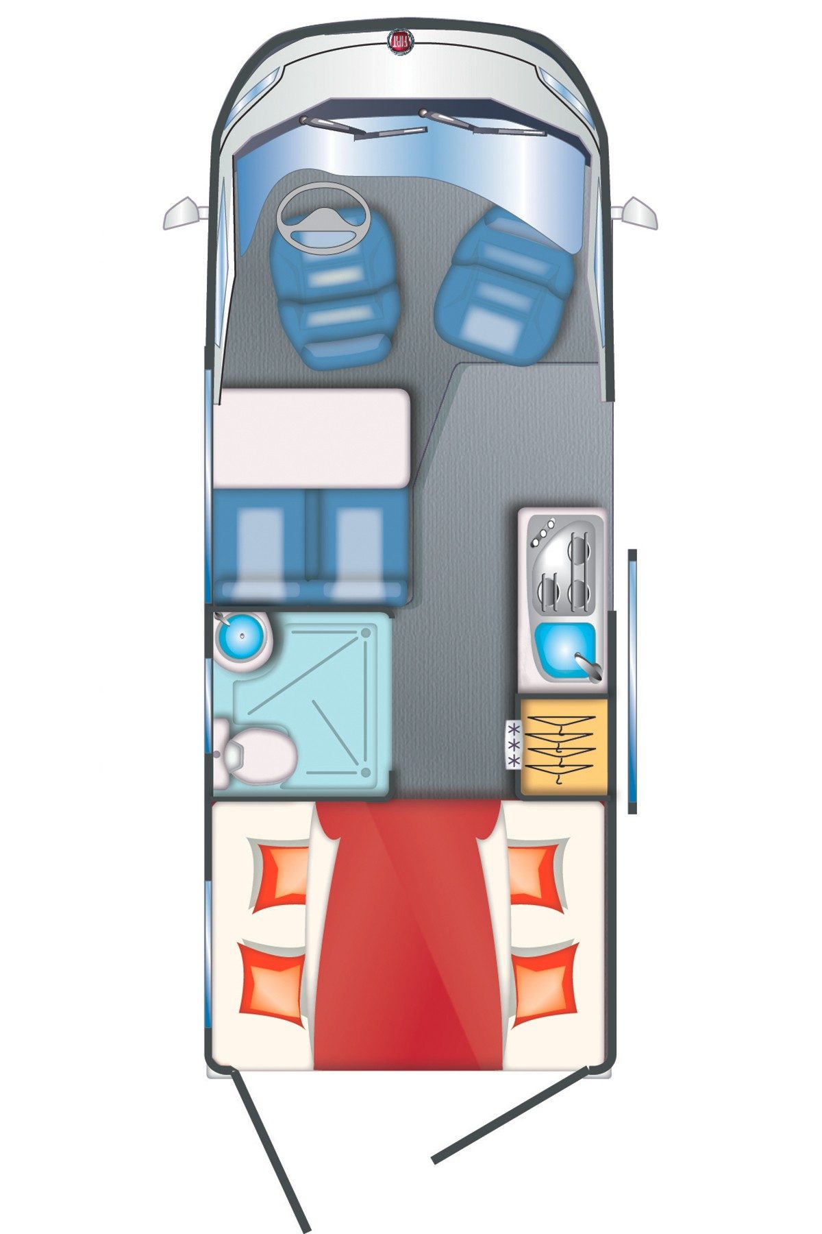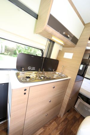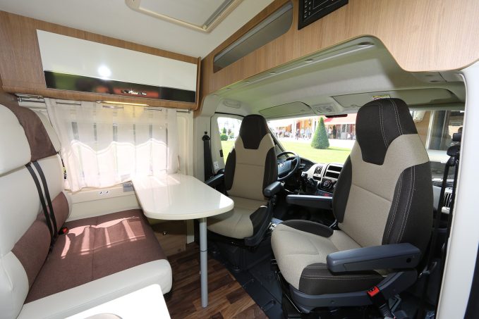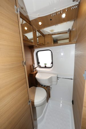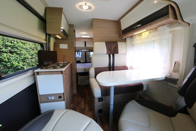 Cette dernière justement peut accueillir 4 convives autour de sa table avec la banquette droite et les deux fauteuils pivotants de la cabine. Au niveau du bloc cuisine, vous aurez un réchaud 2 feux, un évier et une rallonge articuler pour augmenter l’espace du plan de travail. Dans le prolongement du bloc, une grande armoire accueille le réfrigérateur en haut et une penderie dans la partie basse. Ce qui s’avère très pratique à l’usage ! Enfin, dans la salle-d ’eau est équipée d’un cabinet de toilette et du bac à douche au sol. Pour faciliter l’usage de l’un ou de l’autre, le lavabo coulisse sur un rail pour libérer le WC ou la douche.
