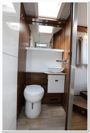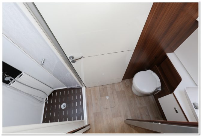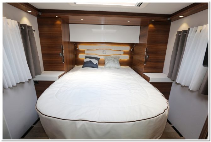 La salle d’eau est en deux parties : d’une part, on a le cabinet avec lavabo et rangements et d’autre part, la cabine de douche. Les deux espaces peuvent être réuni grâce à un double cloisonnement et ainsi occuper toute la largeur du camping-car. Au fond du véhicule, se situe la chambre à coucher avec un lit central de 145 x 195 cm. On retrouve des penderies de chaque côté du lit. En complément, un lit de pavillon double est intégré au-dessus de la cabine de pilotage. Ainsi, on dispose en tout de 4 places couchages à bord.