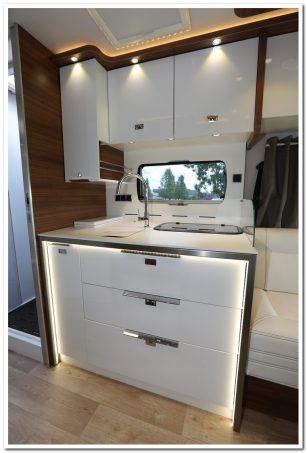 Le constructeur français Le Voyageur, installé sur le créneau du haut-de-gamme, propose cette année une nouvelle ligne de camping-car : la collection Signature. Dans cette gamme, on trouve l’intégrale I8.0 CF qui compte 5600 kg de PTAC sur un châssis Iveco. Pour habiller l’extérieur du véhicule, Le Voyageur a opté pour une élégante sobriété. Un esthétisme que l’on retrouve à l’intérieur avec une ambiance claire. Le bloc cuisine est en enfilade avec le salon. Il dispose d’un évier, d’un réchaud 2 feux et de nombreux tiroirs et placards à la façade blanche. En face, on trouve un réfrigérateur AES de 190 l. Du coté de la dinette, deux banquettes en vis-à-vis enserrent une grande table rabattable. Le passage est aisé, confirmant le fort sentiment d’espace que l’on a dans l’habitacle.