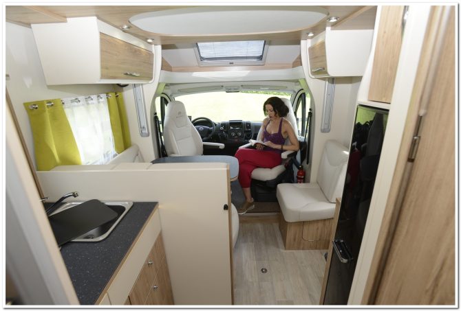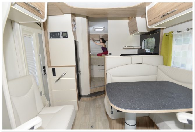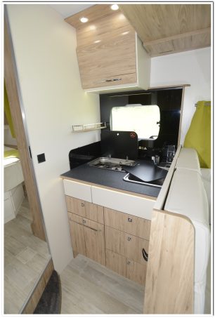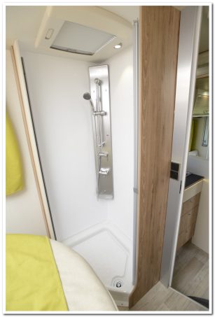 Dans le salon, la banquette sera droite ou en L selon la finition ou l’option choisie. Dans son prolongement, vous trouverez le bloc cuisine, équipé de deux réchauds. Du côté de la salle d’eau, vous aurez d’un côté la cabine de douche et de l’autre, le cabinet de toilette et le lavabo. Toujours dans la partie nuit, vous noterez le changement au niveau des penderies. En effet, elles sont à présent suspendues afin de dégager plus d’espace pour les tables de nuit.