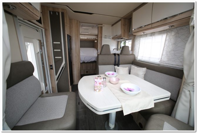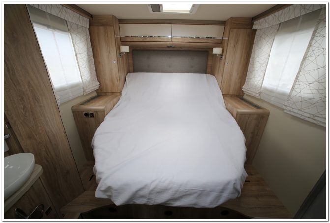 Avec son Profila RS 695 QB Excellence, Eura Mobil propose un profilé de 7,09 m de long avec un bel espace dans l’habitacle. Pour la partie salon, vous aurez une banquette en L et un sofa, encadrent une grande table centrale. A l’arrière, la cabine de douche située juste en face de la salle d’eau, est implanté au pied du lit centrale. Ce dernier est réglable en hauteur afin de libérer plus d’espace en soute. A l’avant, le lit de pavillon qui offre un couchage supplémentaire de 2 places, est parfaitement bien intégré au plafond, au point de passer inaperçu.