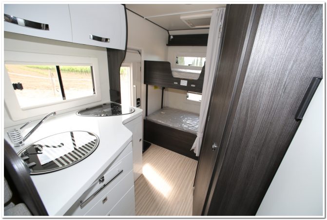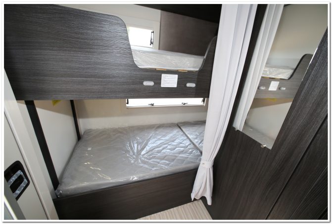 Juste au-dessus, un lit de pavillon, également double, s’abaisse très facilement. Les deux derniers couchages se trouvent à l’arrière, sous forme de couchettes superposées de 2,10 m par 85 cm. Notez que celle du bas peut-être relevée afin d’agrandir la soute.