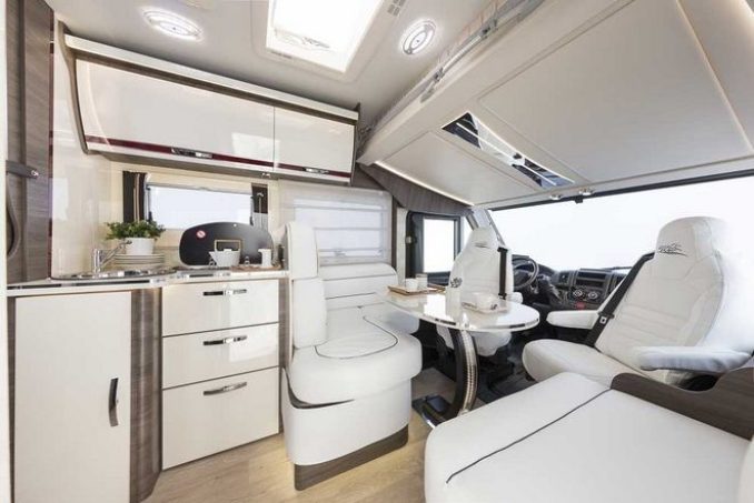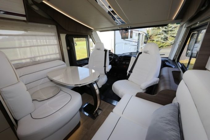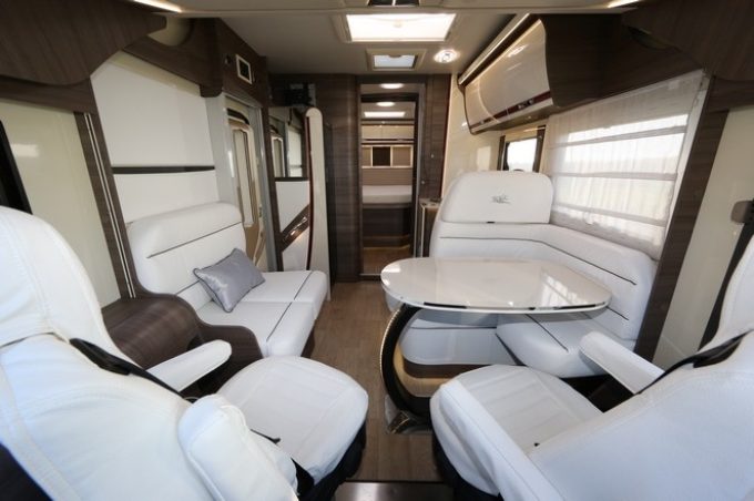 La traditionnelle banquette en L accommodée d’un sofa latéral a été conservée. En revanche le sens du bloc cuisine en L a été inversé par rapport à ce qui se fait conventionnellement. L’objectif visait à libérer de la surface au plancher pour apporter un maximum de confort aux utilisateurs.. Le résultat est des plus probants. On appréciera notamment le salon version « lounge » mise en valeur par une méridienne dans laquelle il fait bon s’assoupir.