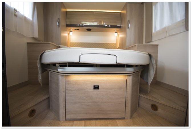 Avec le 650 F, Rapido propose un profilé inédit, répondant à la demande du marché. C’est-à-dire un lit central dans un véhicule compact. De seulement 6,59 m, le camping-car accueille à l’arrière, un vrai lit aux dimensions généreuses avec un matelas Bultex sur un sommier à lattes. Pour bénéficier d’une troisième place de couchage, il faudra prendre en option, la dinette convertible.
