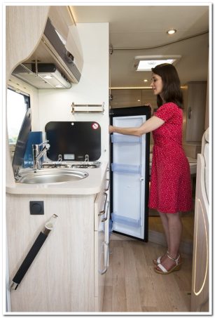 Les concessions qu’impose la compacité se font d’abord dans le coin cuisine, qui dispose tout le même d’un évier et d’un réchaud 2 feux ainsi que d’un réfrigérateur de 135 l. Puis enfin dans la salle d’eau modulable dont le lavabo est rabattable.