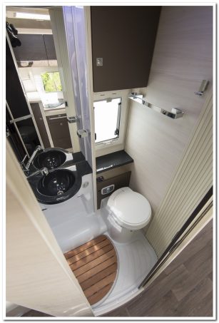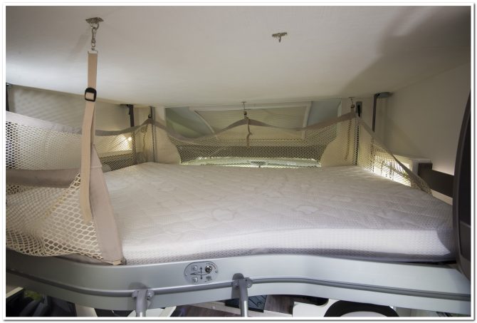 Chacun des deux salons bénéficie d’un couchage grâce aux lits de pavillon nichés au plafond. Notez que les deux lits s’abaissent électriquement sans aucun effort ! Entre les deux espaces, vous trouverez d’un côté la cuisine et de l’autre, une salle d’eau équipée d’une douche, d'un lavabo et d'un cabinet.