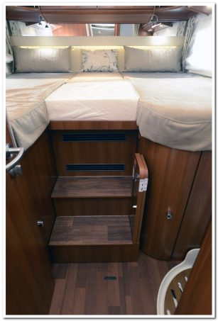 Dans la partie arrière du camping-car, vous trouverez des lits jumeaux placés en hauteur. Ils sont facilement accessibles par un petit escalier central. A l’avant, on identifie un lit cabine conférant un total de 4 places couchage.