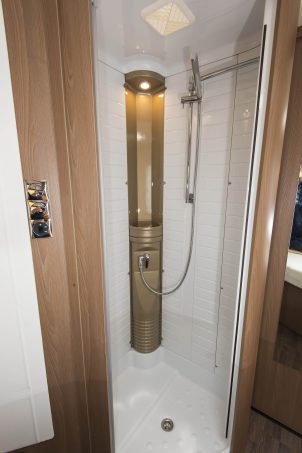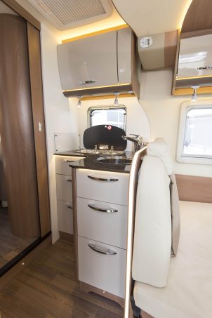 Dans la partie salle-d’eau, la cabine de douche et le cabinet de toilette sont séparés et disposent tous deux d’un volume appréciable. Au niveau de l’équipement, le Lyseo T 700 Privilège dispose du régulateur de vitesse, des stores cabine ou encore d’une hotte aspirante.