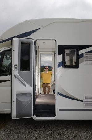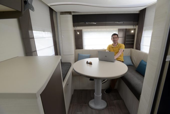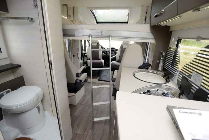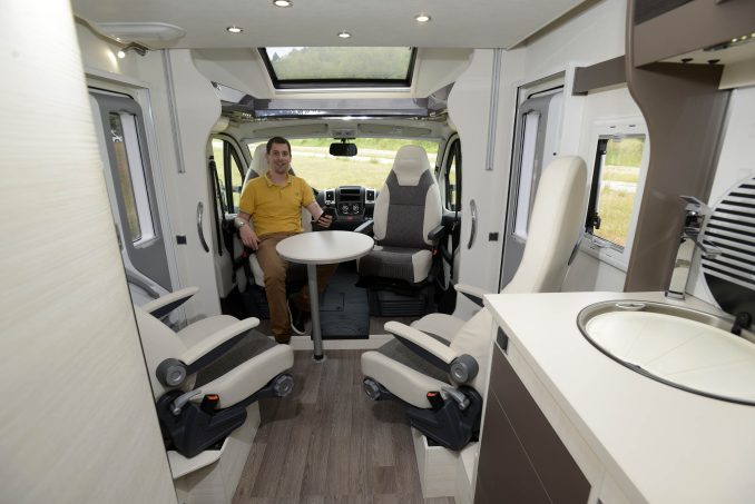 Le profilé 611 Welcome dans cette série spéciale Travel Line, proposée par le constructeur français Chausson interpelle déjà dès l’extérieur. Le véhicule de moins de 7 m dispose de deux portes d’entrée façon automobile. Les 4 places homologuées sont réparties autour d’une petite table ronde. Sur la droite, la cuisine équipée d’un réchaud trois feux et d’un évier, s’étire le long du couloir. A gauche, vous trouverez la salle d’eau avec douche et WC.