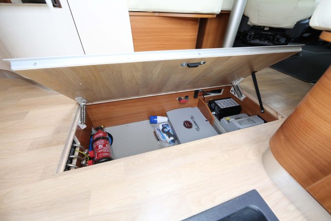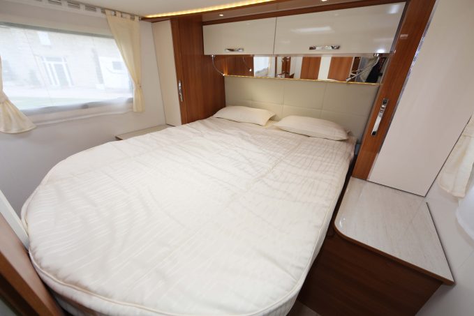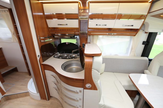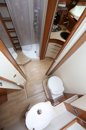 Le cabinet de toilette transversal possède une cloison attenante au pied du lit principal. Il fait face à une cabine de douche spacieuse. La cuisine, très fonctionnelle, dispose de nombreux rangements, d’une hotte aspirante et d’un frigo de 150 litres. Quant au mobilier laqué Poirier, il donne à l’habitacle un design élégant et moderne. Concernant l’équipement de série, il est honorable : régulateur, climatisation cabine, feux diurnes à leds, autoradio intégré. Reste les stores plissés de cabine qui sont hélas en option. Le seul point noir du Discover 74 CTC est sa faible charge utile : 312 kg. Question prix, comptez 82 900 euros pour l’achat de ce camping-car.