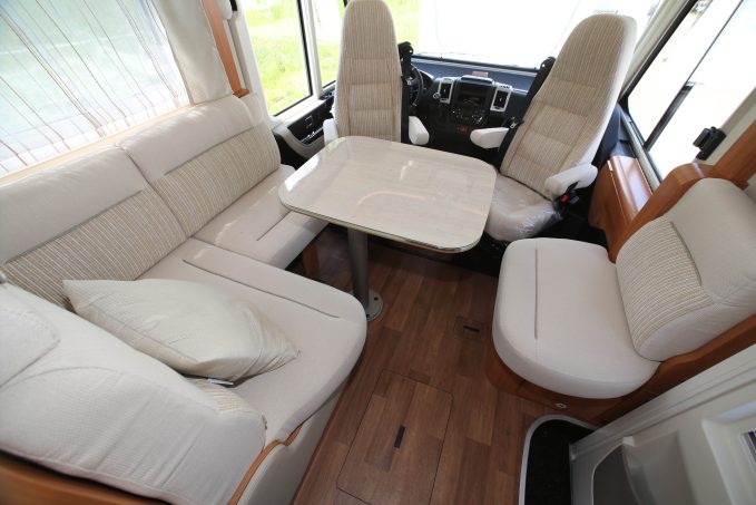 L’intégral Hymer B-DL 678 avec ses 7,49 m est un camping-car à l’intérieur étonnant. Son plancher est totalement plat, de l’avant jusqu’à l’arrière du véhicule. La circulation à bord est facile, favorisée par l’espace du vaste salon et sa banquette disposée en L. Le mobilier est clair et fonctionnel.