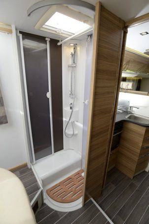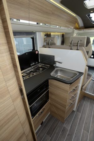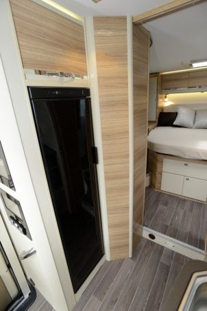 L’habitacle n’est pas en reste puisqu’une fois pénétré par la large porte cellule (optionnelle), une ambiance contrastée se dégage avec un mobilier clair très nervuré utilisé pour les décors de parois des meubles, alors que le plancher et la sellerie (spécifique Platinum) opte pour un coloris foncé. Toutefois il s’agit là d’un pack facturé 1 690 € supplémentaires au prix du Coral de base.