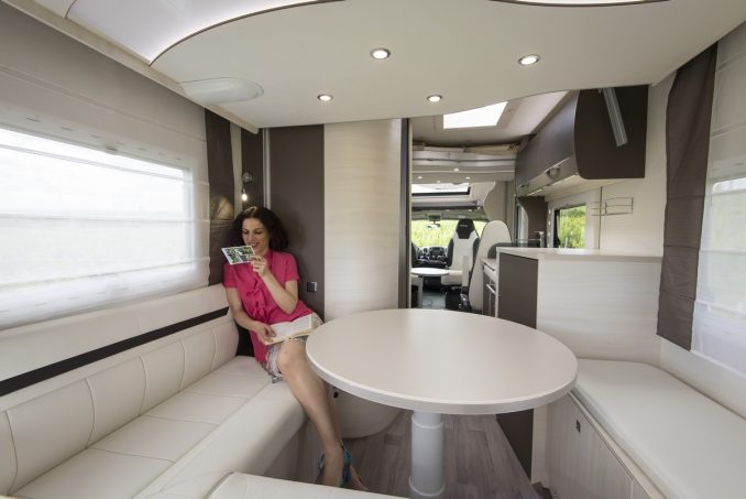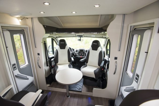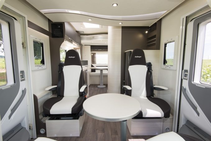 L’objectif recherché est d’offrir un caractère automobile à ce modèle avec pour chaque occupant, un accès direct et surtout autonome. Car pour la route, Challenger a souhaité intégré de vraies assises individuelles. Exit donc la traditionnelle banquette face route, place désormais à deux sièges indépendants signés FASP, logés sur une embase pivotante et réglables de la même manière que les sièges cabine Fiat. A noter qu’une petite table peut permettre de créer un petit salon cosy en complément du coin repas situé en partie arrière.