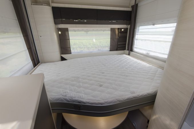 Outre sa partie avant, l’originalité provient également du choix d’un salon arrière en L (voire U avec une banquette amovible peut confortable mais existante) surmonté d’un lit de pavillon double complémentaire à celui présent à l’avant.