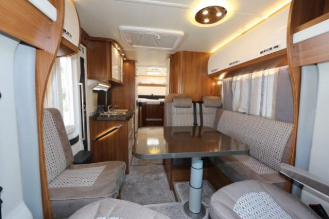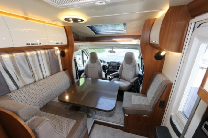 L’accès à bord se fait par une porte extra large sécurisée par un double verrouillage. Et contre les insectes, une moustiquaire se déploie devant l’ouverture. A l’intérieur, l’ambiance est assez remarquable. Les portes des placards en blanc laqué se marient parfaitement avec la teinte miel des caissons. Bonne note également à la sellerie, confortable et revêtue de jolies housses gris-chiné. L’ensemble est mis en valeur, le soir venu, par des éclairages à LED directs et indirects.