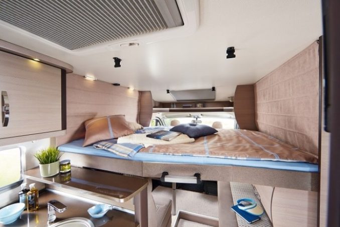 La cuisine latérale est franchement réussie, pourvue de vastes tiroirs, avec un bloc assez long pour dégager un grand plan de travail à proximité de l’évier. Dans le prolongement se situe un réfrigérateur « Slim » de 140 litres, à sélection automatique d’énergie.