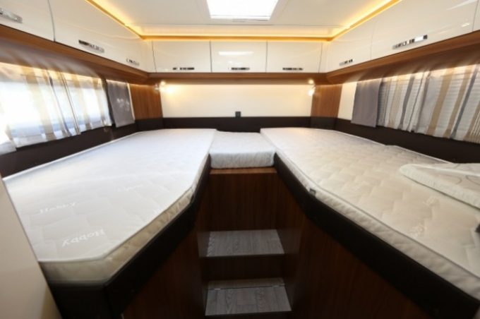 La chambre, pour sa part, se compose de deux lits jumeaux, assez hauts par rapport au plancher, mais accessibles grâce à un escalier central à deux marches. La hauteur importante des couchages permet de gagner du volume pour les penderies installées à leur pied et, bien sûr, dans la soute. Les lits sont formés de matelas en mousse haute densité et de sommiers à lattes de qualité. Les dimensions sont bonnes (200 x 76 + 190 x 76 cm). La partie centrale se prolonge, convertissant alors les lits jumeaux en couchage matrimonial.