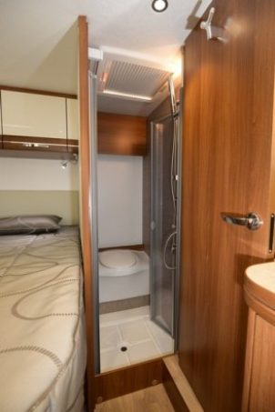 Un mini-lavabo trouve sa place dans un meuble d'angle, le long de la paroi. Une fois le mitigeur replié, l'ensemble disparaît sous une tablette. En l'absence de lit de pavillon, les rangements en hauteur ne manquent pas. Le coin dînette peut servir de couchage d'appoint à un adulte ou deux enfants (193 x 92,7 cm). La table s'équipe pour cela d'un pied télescopique. Ce Magister dispose aussi d'un équipement complet côté cuisine (grand réfrigérateur en position surélevée, réchaud à trois feux en ligne, hotte aspirante), comme en cabine (clim’, double airbag, vitres et rétros électriques).