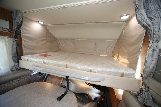 Le soin apporté à la partie nuit est maximal. C’est déjà vrai chez Hymer dans les gammes inférieures alors imaginez dans un Premium Line. Le lit central est un excellent préambule. Le matelas en mousse froide multizones repose sur un sommier à lattes à tête relevable. En dessous, une lingère à trois tiroirs complète une kyrielle de rangements dans le double plancher accessibles par des trappes. Le lit de pavillon au-dessus de la cabine peut être électrique (en option).