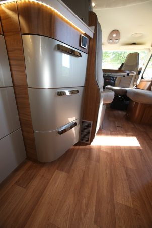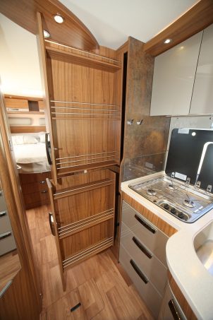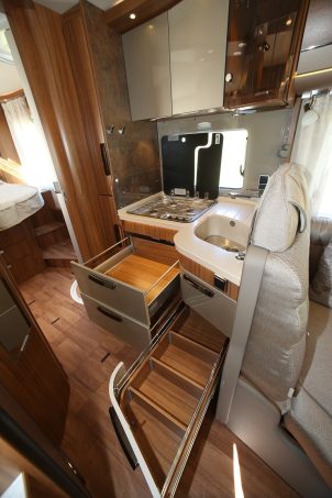 Haut niveau d’équipement ! En l’occurrence, le B 708 Premium Line a quelques trucs en plus : la commande programmable du chauffage, la vidange électrique des eaux usées et le plancher de garage en structure allégée (au final plus de 1000 kg de charge utile). Sans oublier la cuisine Gourmet, un meuble incroyable avec une quantité de rangements inconcevable dans des dimensions réduites. Ajoutez à notre photo la présence de deux tiroirs verticaux sur toute la hauteur de la cellule juste avant la porte coulissante à l’entrée de la chambre.