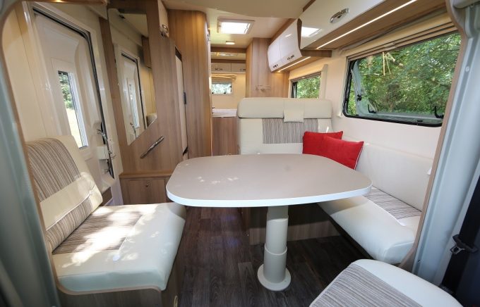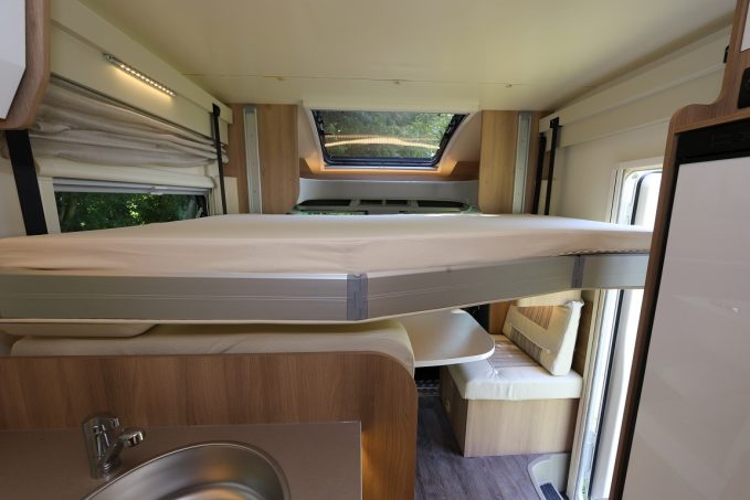 Le Kronos 298 TL profite d’un très bon niveau d’équipement de série. La clim’ cabine et l’autoradio sont d’origine. Tout comme la caméra de recul et le panneau solaire. La porte de cellule est pourvue d’une moustiquaire. Le lit de pavillon est manœuvré par un moteur électrique. Accordons au passage un bon point à la motorisation 155 ch –très- performante du Ford Transit.