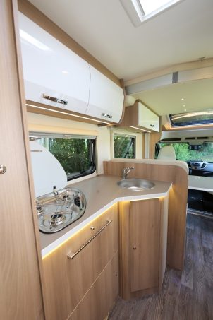 La partie avant est logiquement occupée par le maxi salon. Bonne nouvelle, les sièges de cabine du Ford Transit tournent plus facilement qu’auparavant (il n’est plus utile d’ouvrir les portières pour effectuer la manœuvre) La cuisine est vaste. On apprécie notamment les dimensions exceptionnelle du plan de travail. Et la grande quantité de rangements.