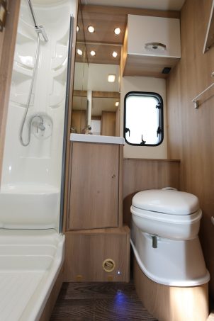 Les éclairages à LED sont soignés et efficaces. Ils diffusent une lumière directe et indirecte qui apporte une chaleureuse ambiance à la nuit tombée. La salle d’eau est simple. Il s’agit d’un seul local avec douche séparée du coin toilette par une cloison plexiglas.
