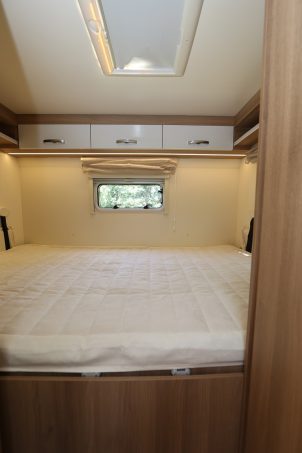 Le lit permanent est en position transversale. Ses dimensions sont parfaites pour un couple. Le matelas est dit ergonomique et anti condensation. Il repose naturellement sur un sommier à lattes. La hauteur du couchage est modulable, ce qui permet de varier le volume de la soute convertible en garage à vélos. On agit sur la hauteur avec une manivelle insérée dans