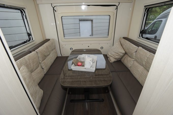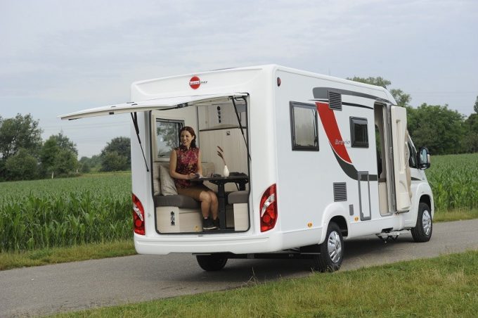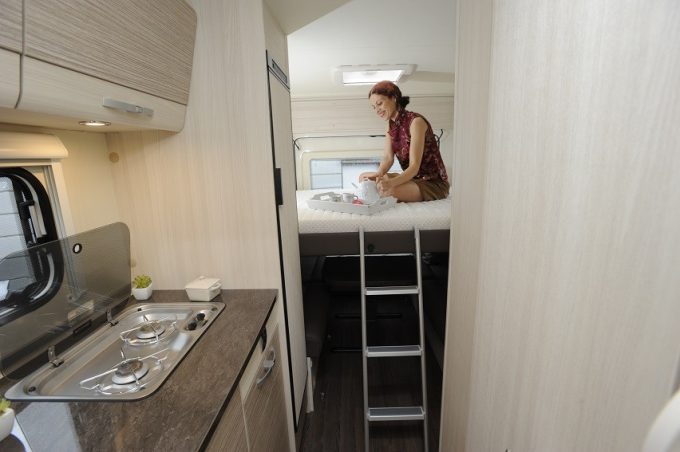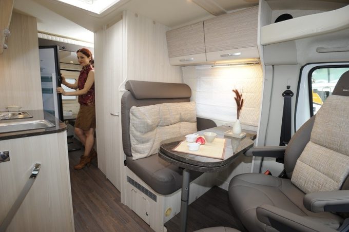 Le Brevio est de ceux-là, profitant en complément de dimensions contenues d’une charge utile exceptionnelle (760 kg). Même à peine supérieur à 6,50 m de long, le T 646 est un des grands de la famille, ce qui lui permet de profiter d’un grand réfrigérateur de 142 litres dans le prolongement de la cuisine. Son plan est original, avec double dînette et lit de pavillon transversal à descente verticale au-dessus du salon arrière. Reste que la particularité du Brevio c’est encore et toujours, sur cet arrière, la présence d’un hayon relevable pour prendre un repas dedans/dehors ou s’autoriser une sieste (dans le lit escamotable) avec vue sur la vallée.