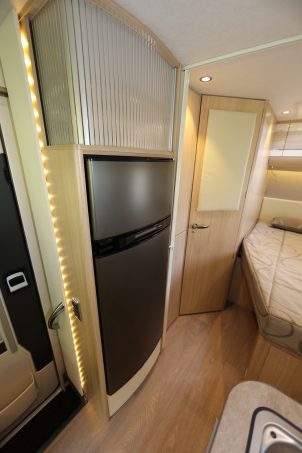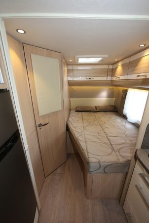 En l'absence de lit de pavillon, seule la banquette peut être transformée en couchage d'appoint à une place. Le lit permanent, à la française, présente des côtes modestes (185 x 130/100 cm) qui pourraient gêner les gabarits les plus forts. Pratique, son sommier se relève pour accéder à la soute de l'intérieur. Notez encore que l'isolement avec la cuisine et le salon n'est assuré que par une fine paroi souple.