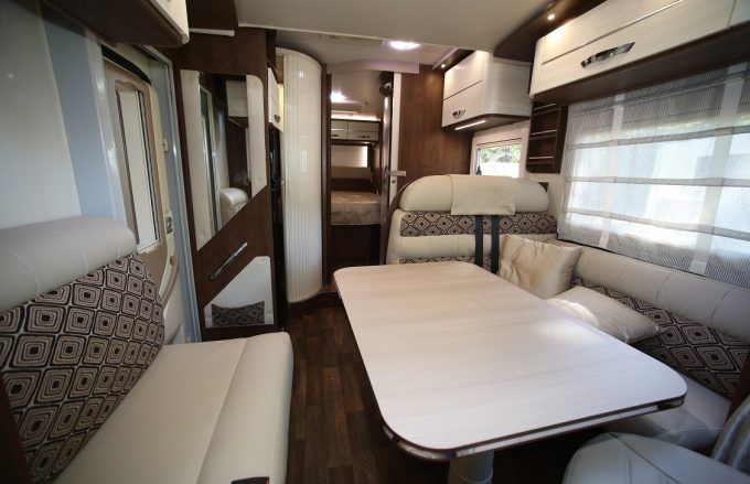 Il est ici paré du tissu Octavia qui, mélangé à des parements simili cuir, lui donne un côté classique mais contemporain. Le salon est à montrer en exemple avec ses profondes banquettes, sa table pivotante et coulissante sur deux axes à 360° et son superbe décor de dessous de lit. Côté cuisine, on apprécie les belles proportions du réfrigérateur, le plan de travail généreux et le grand évier. Le tiroir à couverts est même rétroéclairé à son ouverture.