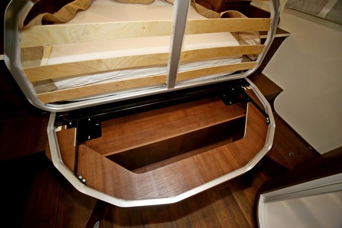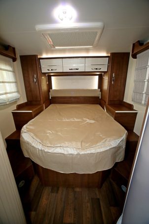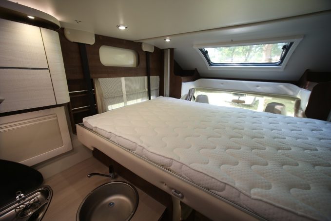 Le couchage central arrière se relève pour améliorer le volume du garage et le sommier à lattes du lit central se relève aussi au pied afin de dégager l’accès à un grand coffre de rangement. On apprécie tout particulièrement l’effet 3D du tissu apposé sur la tête de lit. Le lit de pavillon avant a beau se faire étroit (125 cm), il occulte partiellement un rangement mural et l’évier lorsqu’il est abaissé, ainsi que la porte d’entrée.